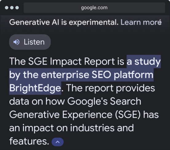 - In February we saw the appearance of a "Listen" button, which we spotted for a limited number of queries during the week of February 19th. However, this feature stopped appearing by February 24th. While these changes might not have immediate implications for SEO strategies, they do suggest that Google is open to exploring different formats within SGE.