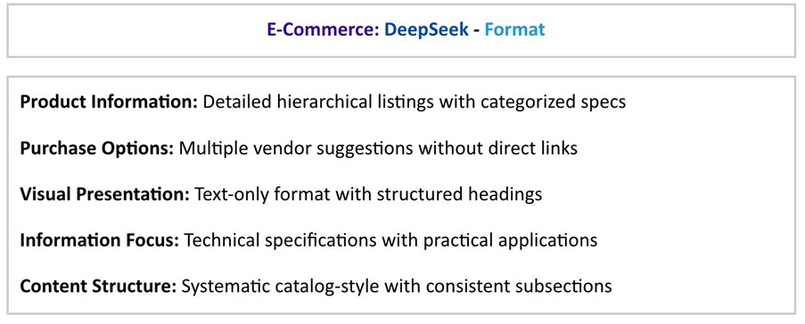 Overall, DeepSeek's response to the e-commerce query seems to emphasize providing a structured, comprehensive catalog of product details and purchase information.