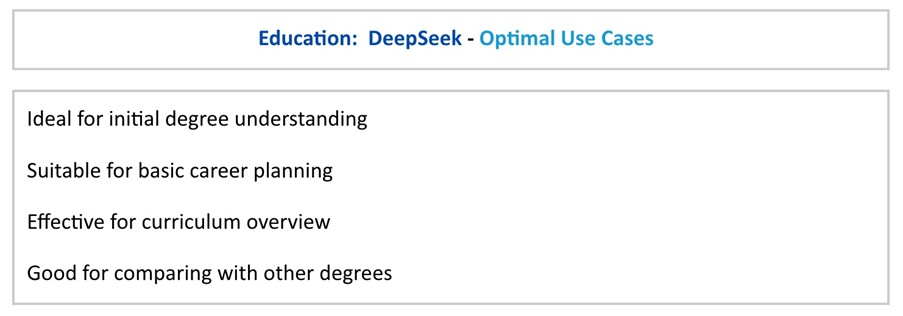 Overall, DeepSeek's response to the education query seems to provide a clear, structured overview of a BBA degree program, with a strong focus on practical applications and career pathways. While it lacks some visual elements and specific institutional details, its systematic approach and balanced coverage make it a helpful starting point for understanding the core aspects of this business degree.