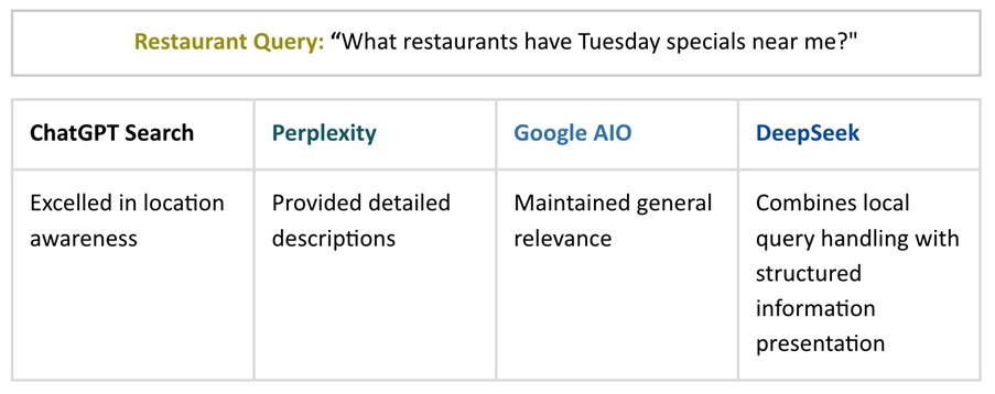 The AI also shows awareness of the need to categorize local offerings (grouping by cuisine type) while maintaining strict relevance to both time constraints ("Tuesday") and implied geographic bounds ("near me"). Additionally, it recognizes the difference between chain-wide promotions and location-specific offers, suggesting a hierarchy in how it processes local business information.