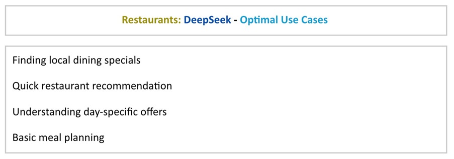 Overall, DeepSeek's approach to the restaurant's query seems to emphasize providing structured, day-specific 'specials' information across multiple options.