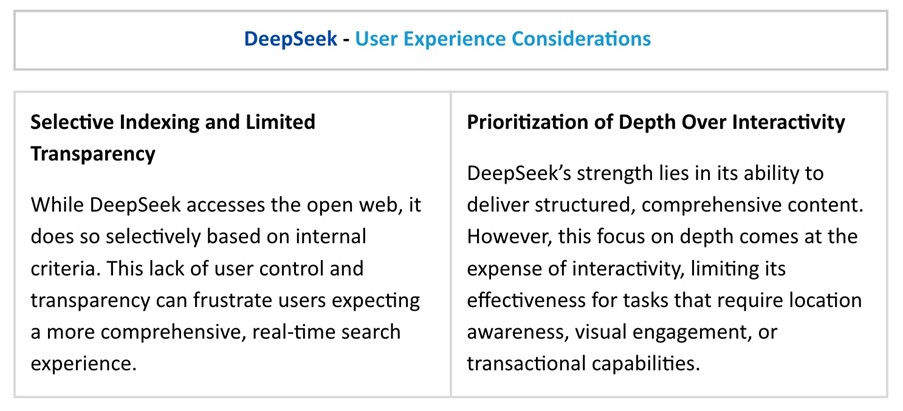 Unlike AI search platforms like Google AI Overviews, ChatGPT, Perplexity, and Bing Copilot, DeepSeek takes an open-source approach while prioritizing contextually rich responses and lower processing power. But beyond these differences, our analysis reveals three other fundamental ways DeepSeek disrupts the search experience: