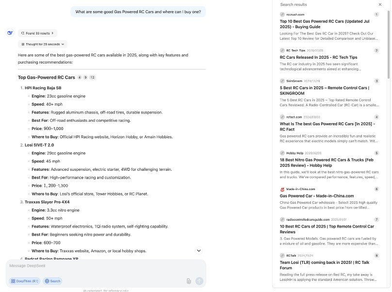 It prioritized establishing product credibility by cross-referencing models that appeared in multiple sources and collecting key purchase-decision data points like engine specifications, speeds, and prices. It also recognized the need to differentiate between various buyer personas by noting features like "Ready-to-Run" for beginners. When addressing the "where to buy" component, DeepSeek showed awareness of channel appropriateness by filtering out bulk/industrial suppliers and instead focusing on channels suitable for individual consumers, including both online retailers and local hobby shops, for hands-on support.