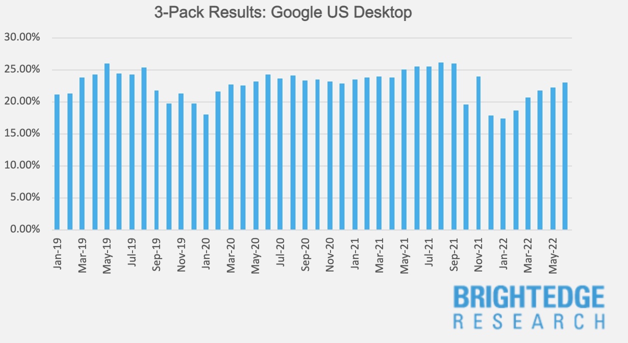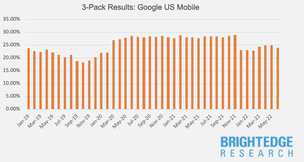 - 3-Pack – After showing steady growth on desktop and an exceptionally flat curve on mobile through most of 2021, a significant change to how Google handles local search drove down the search result type on both mobile and desktop beginning in December. Through June 2022, results on mobile are slowly recovering, while desktop results are steadily rising and once again approaching peak levels.