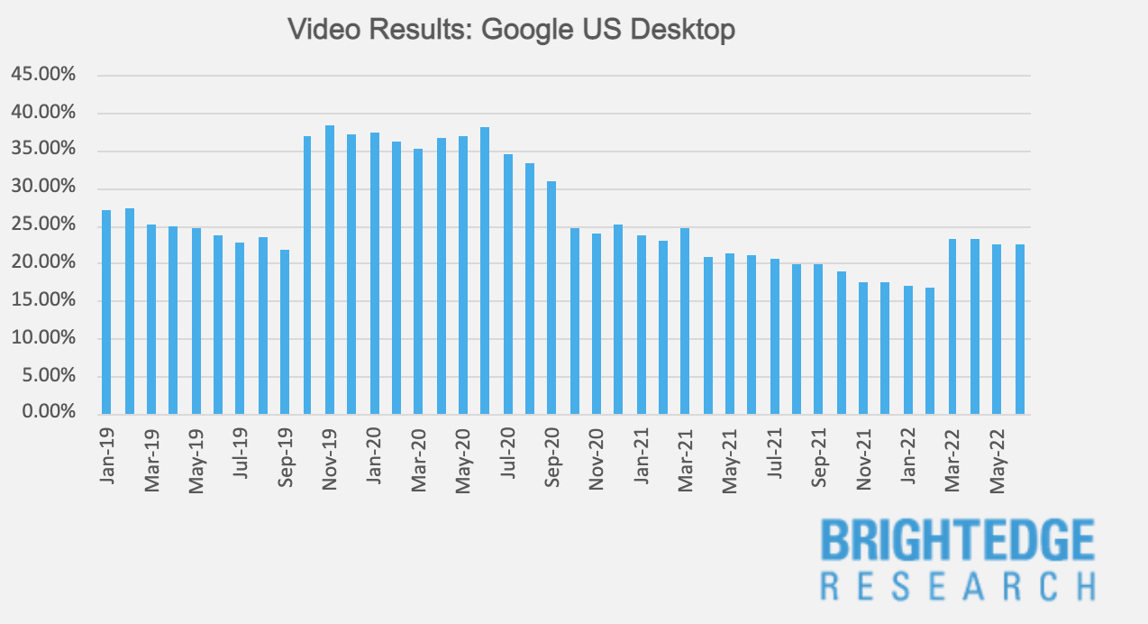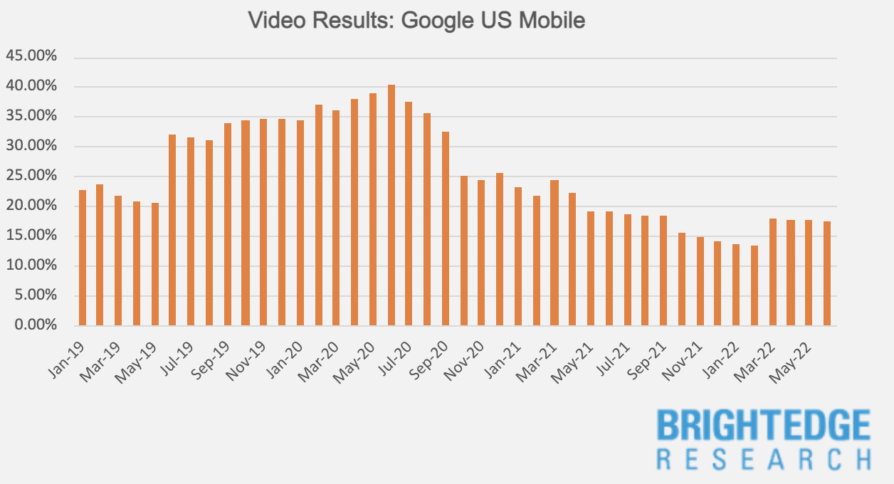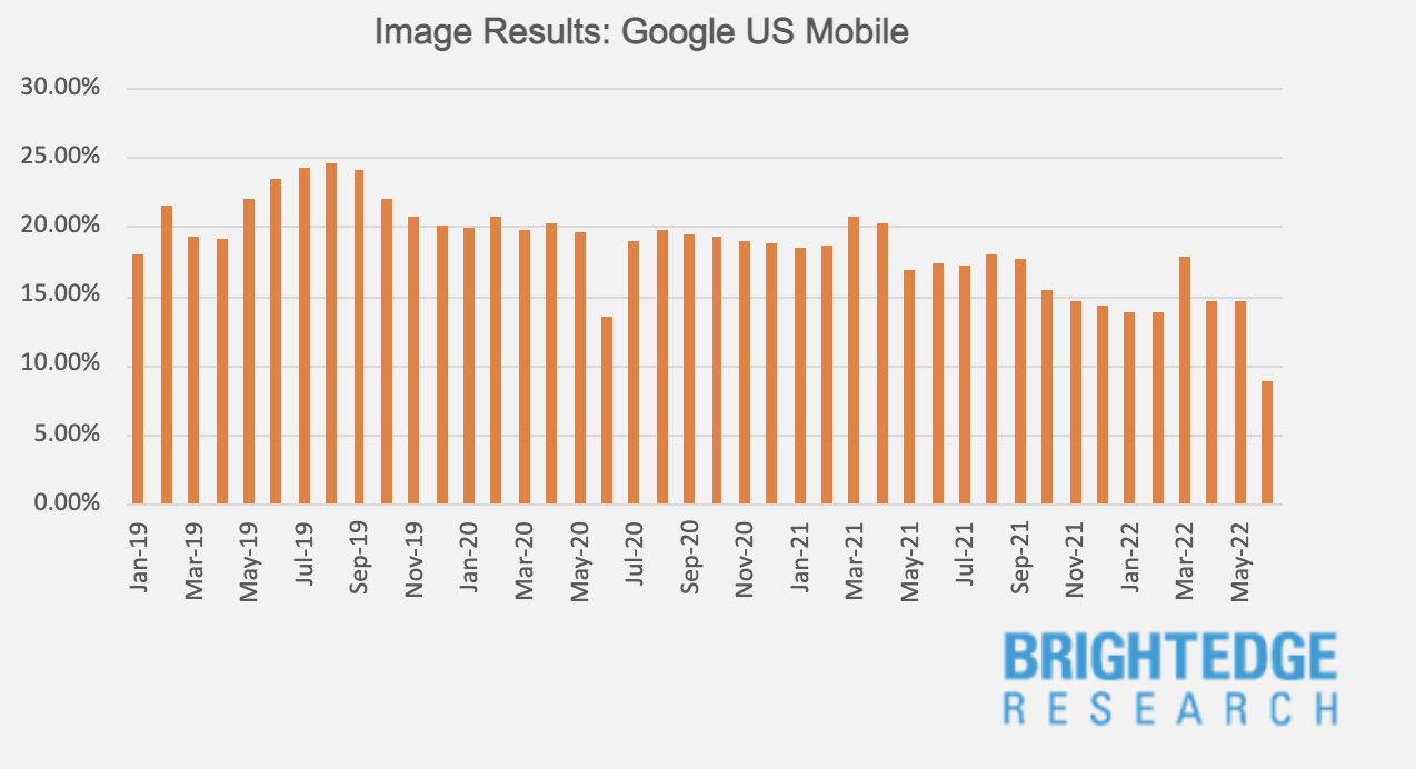 - Images – Results frequency on desktop are trending up since a 3-year low in November 2021 and are now at their highest level in over a year. Image results on mobile continue to trend downward and are now at their lowest point in three years as of June 2022.