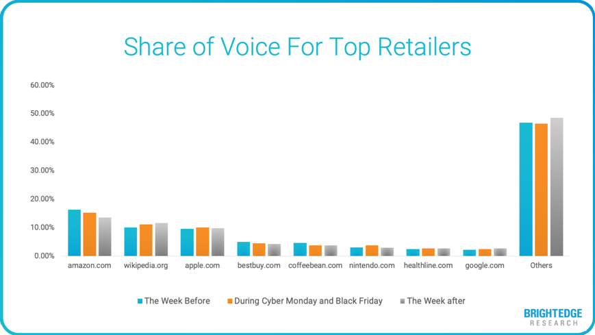 For the 500 keywords we measured, we saw Amazon’s share of voice in organic results decline while during the two days, we saw brands like Apple, Nintendo and Healthline see an increase in their organic presence.