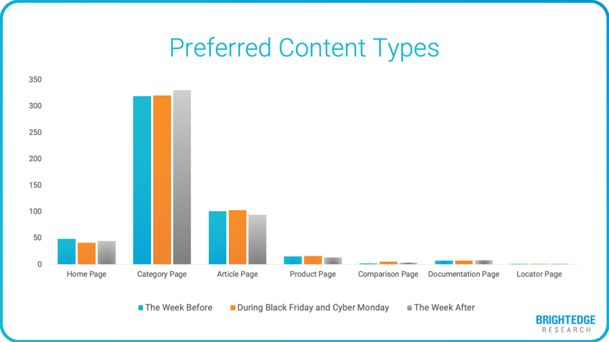 During Black Friday and Cyber Monday, we saw homepages give ground to article and product pages in search engine results pages. While this was not a dramatic shift, it was enough to suggest that richer and deeper experiences do incrementally better during peak shopping periods. If you are launching new products or running promotions, a big splash on your homepage is great, but you need to make sure those deals are prominent on your category and product pages as well, because those may be the pages your customer sees on a search result in lieu of your homepage.