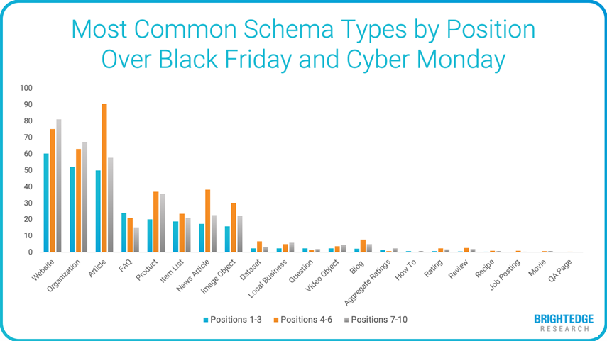 Per what we observed with the slight increase in Wikipedia’s share of voice during Black Friday and Cyber Monday, we suspect that could impact how much product schema was present in the top 3 results. We do note that outside of structural schema, it is the most prominent type we encountered in rankings 4 through 10. Ensure product schema is incorporated in both your category pages and product pages to help engines understand the context of the content.